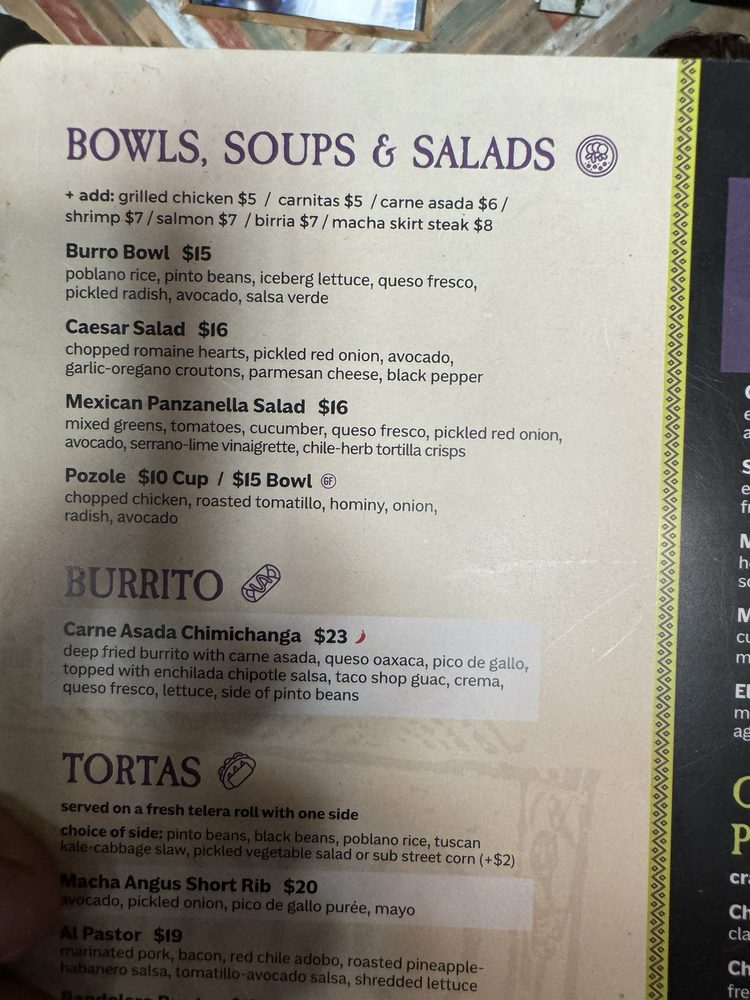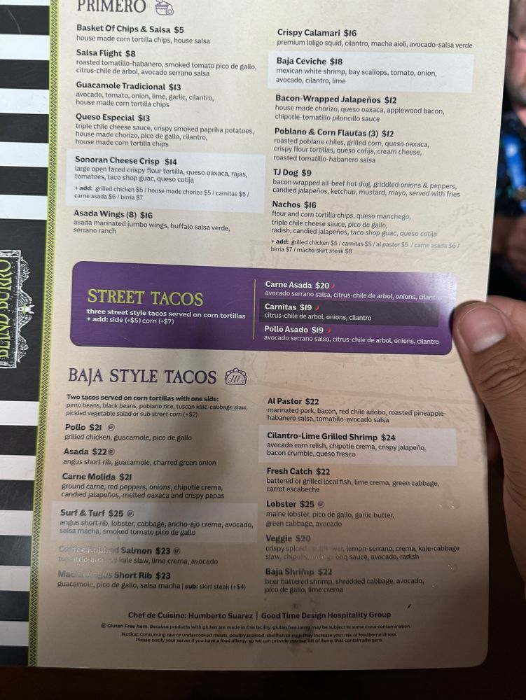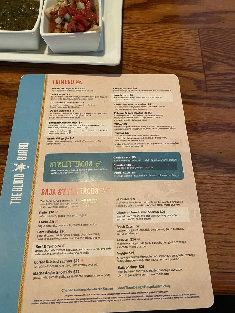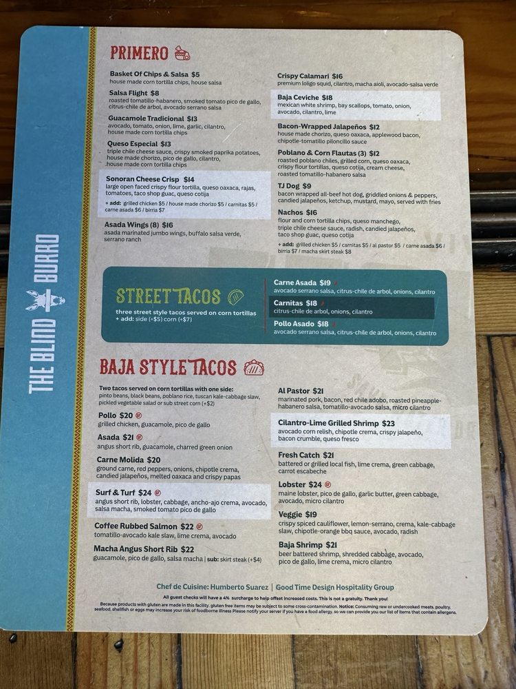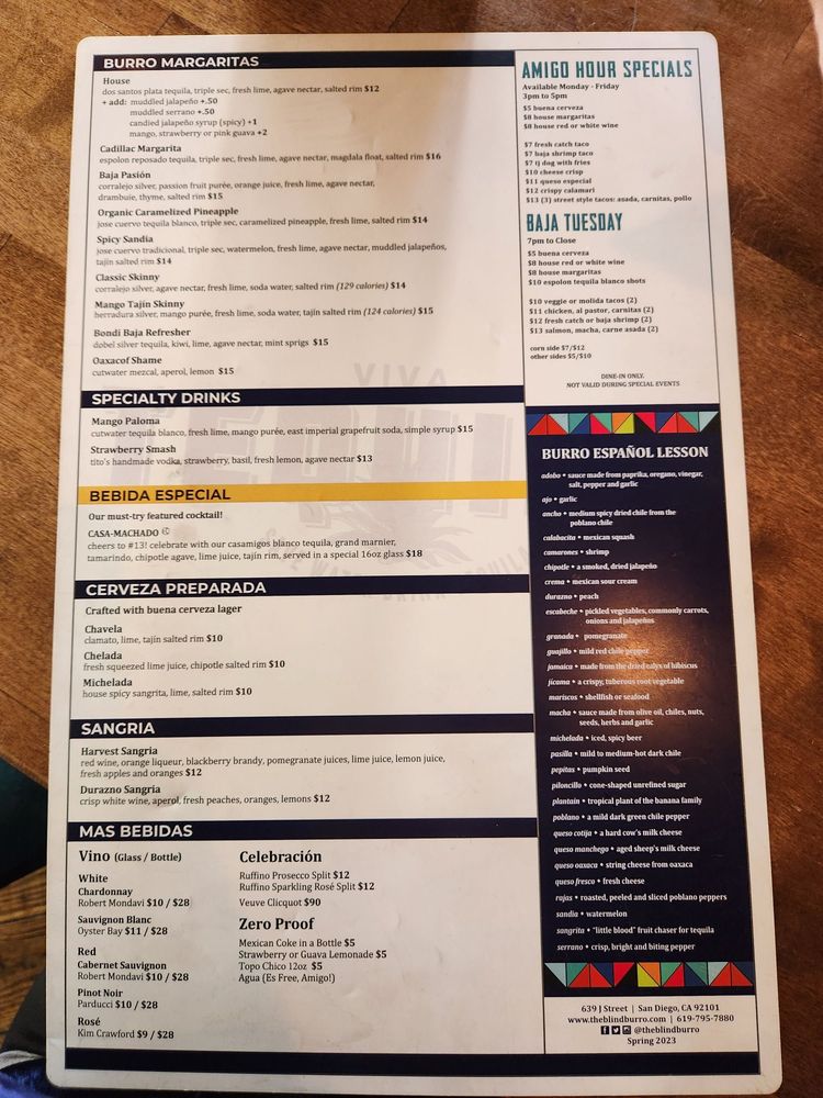 The Blind Burro in San Diego offers a diverse menu with Mexican and seafood options. The restaurant provides a casual atmosphere with outdoor seating and a full bar. Highlights include a variety of botanas such as the Salsa Flight and Guacamole Especial. The Bowls, Sopas y Ensaladas selection features dishes like the Quinoa Salad and Power Bowl. Baja Style Tacos like the Lobster and Carne Asada are must-tries. Customers praise the unique flavors and generous portions, making it an ideal spot for a pre-game meal or a date night. The service is friendly, and the happy hour specials are a great deal. Overall, The Blind Burro offers a vibrant cantina experience with tasty food and excellent drinks.